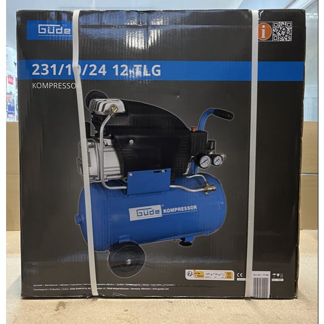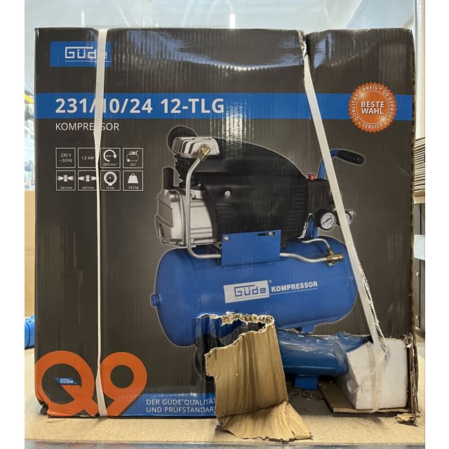 Praktická souprava kompresoru s olejovým mazáním a 11dílného pneumatického příslušenství, vhodná k využití v domácích dílnách, garážích atp. Konstrukce: elektromotor 1,5 kW (-> 2.850 ot./min., typ provozu: S3/50 %), jednoválcový agregát s olejovým mazáním, přímý pohon (-> motor/agregát na jedné hřídeli). Vybavení: 2 manometry, 1 výstup stlačeného vzduchu (-> kovová rychlospojka), tlakový spínač, redukční ventil, pojistný přetlakový ventil, zpětný ventil, olejoznak, vzduchový filtr, 1,4 m přípojný elektrický kabel H05 RR-F. Tlaková nádoba: 24 l, ventil pro vypouštění kondenzátu, přední podpěra s gumovou patkou, plastová kola/transportní madlo pro jednoduchou manipulaci. Příslušenství: hustilka pneumatik, ofukovací pistole, 5 m spirálová hadice, adaptéry k plnění míčů, matrací, jízdních kol apod. Celkové rozměry (d x š x v): 550 x 280 x 600 mm, hladina akustického výkonu LWA: 94 dB (A), stupeň krytí: IP 22.