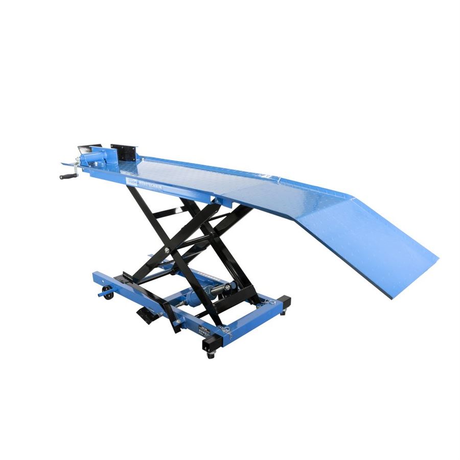 Hydraulická zvedací plošina, určená ke zdvihání motocyklů v prostředí garáží, domácích/servisních dílen apod. (-> maximální nosnost: 360 kg).