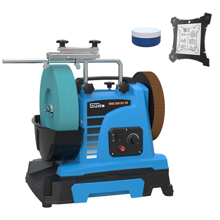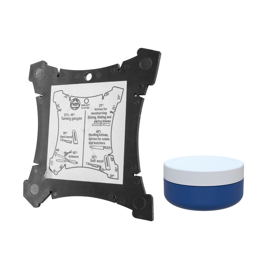 Součástí dodávky je brusný kotouč pro mokré broušení, kožený honovací kotouč, univerzální upínací zařízení, honovací pasta, úhloměr, podstavec stroje se zásuvkou